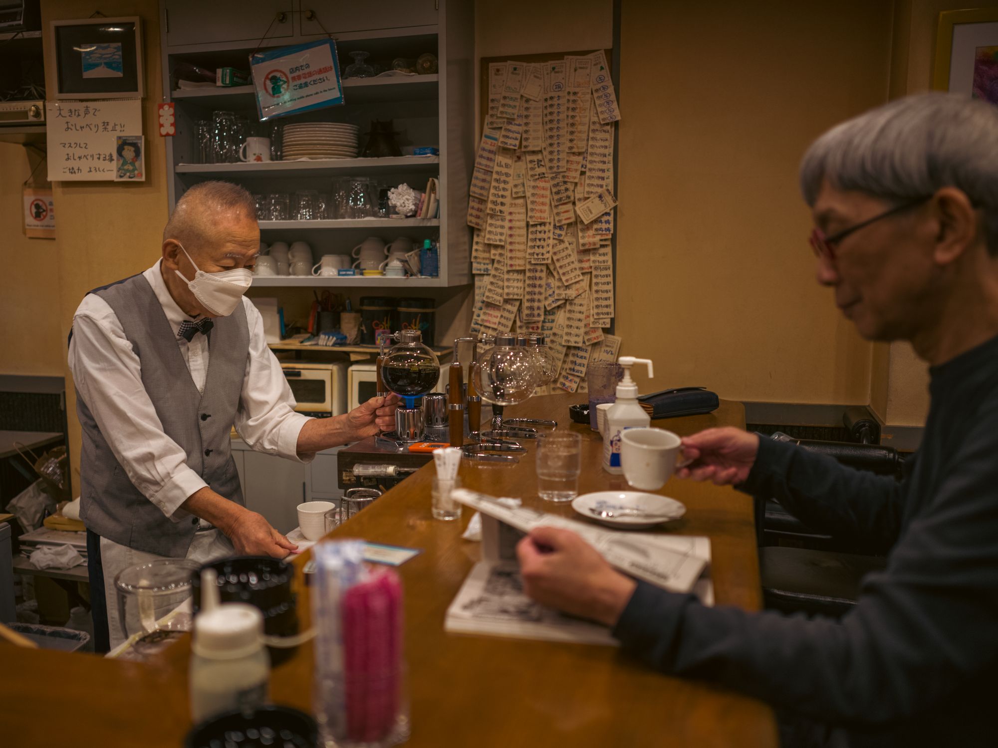 It’s near closing time and everyone just got a free refill of coffee from whatever was left in the siphon. Come 5:30 pm, one of the customers(!) flips the sign on the door — from Open to Closed.