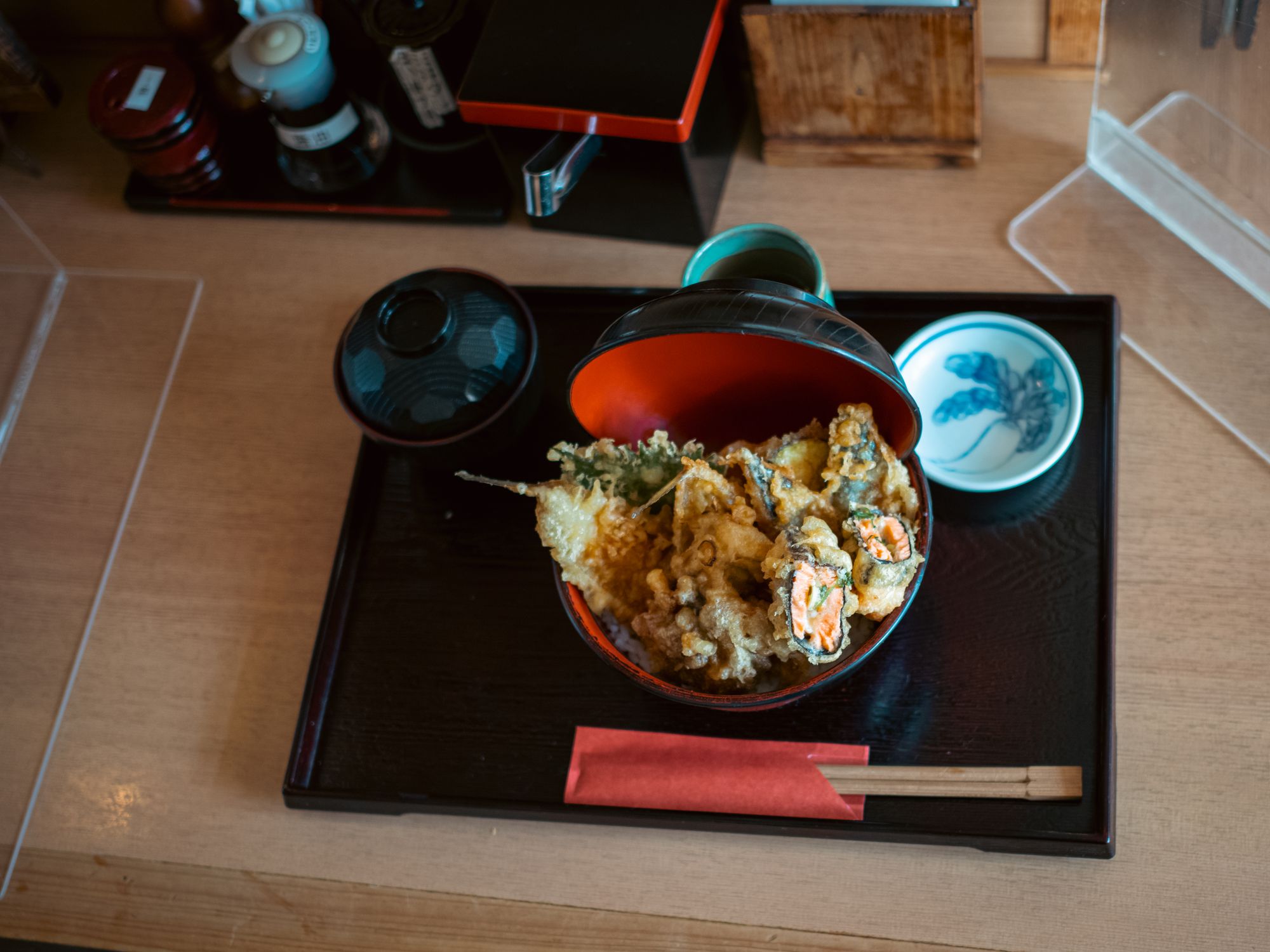 Aki — autumn. Tendon — assorted tempura on top of a bowl of rice. Seasonal special — how could I not. Full of autumn vegetables, mushroom, and fish. The bowl was so packed, that they included additional small plate so you can put some items aside while you enjoy your tempura with rice.